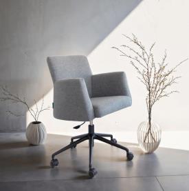 Fauteuil auxiliaire léger et très confortable. Le pied pivotant est en fonte d’aluminium. Hauteur réglée grâce au mécanisme de gaz. Pieds avec option roulettes. Le même modèle avec les pieds en bois s’appelle “Marilin”, et avec pieds et accoudoirs en bois s´appelle “Betty”.